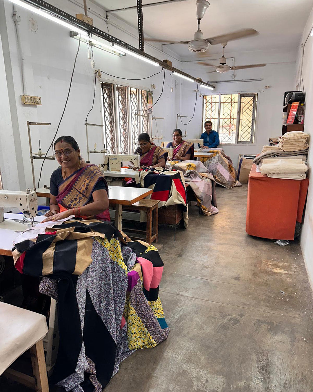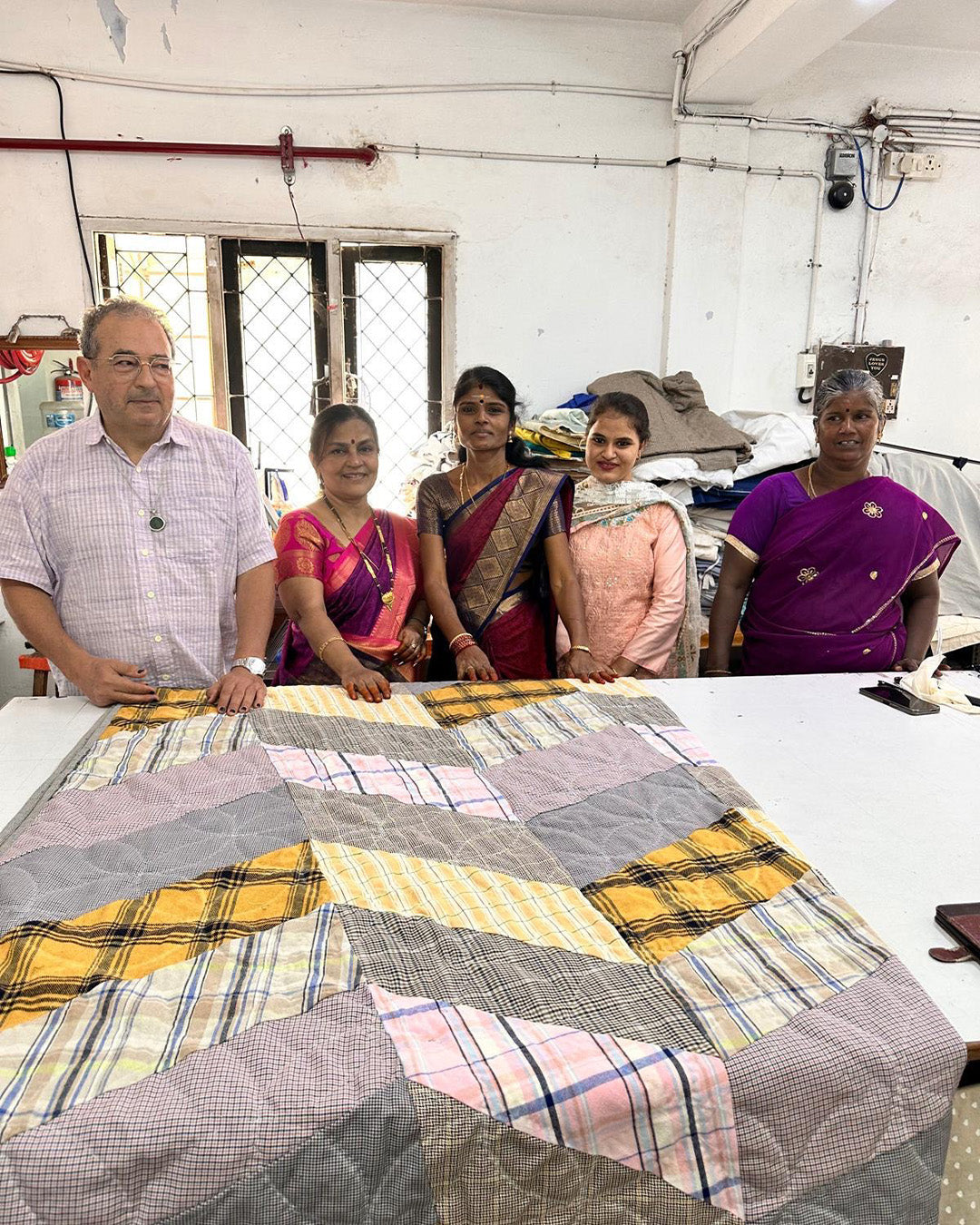 Each Quilt is hand-stitched by patchwork artisans from the Bangalore region of India. “We both have a love of hand stitching, and over this time have collaborated on many things, from the odd t-shirt mended on holidays, to teaching Jean’s daughter Lily to sew many years ago. Our work together has been eclectic, creative and fun.”