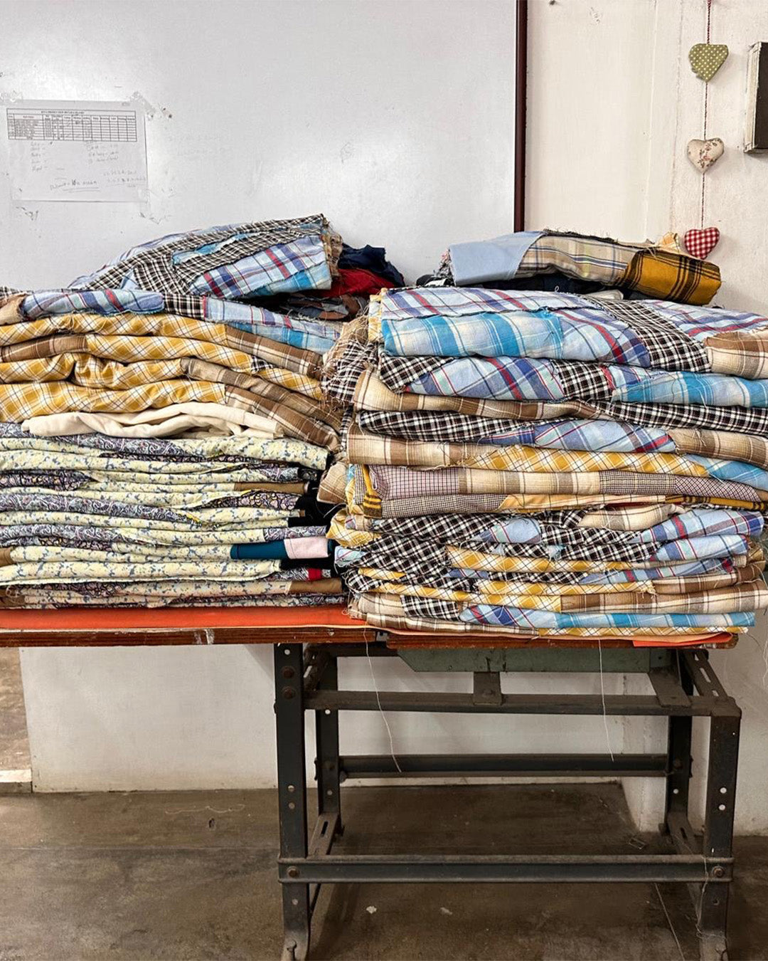 Jessica Ogden, a passionate quilt and patchwork designer, also nicknamed “The Patchwork Queen” started this project with A.P.C. founder jean Touitou. Inspired by the years of archived A.P.C. fabrics available to work with and trying to find a way to recycle them.