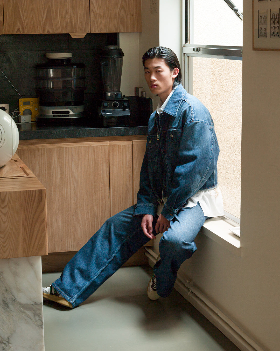 She reworks another A.P.C. wardrobe staple, the jean, with two models: Clinteau, with its high, fitted waist, long, flared leg and quilted pleat detail on the front, or Madame Santeuil, mid-rise waist, wide leg, with a white tie at the waist, evocative of the 1970s.