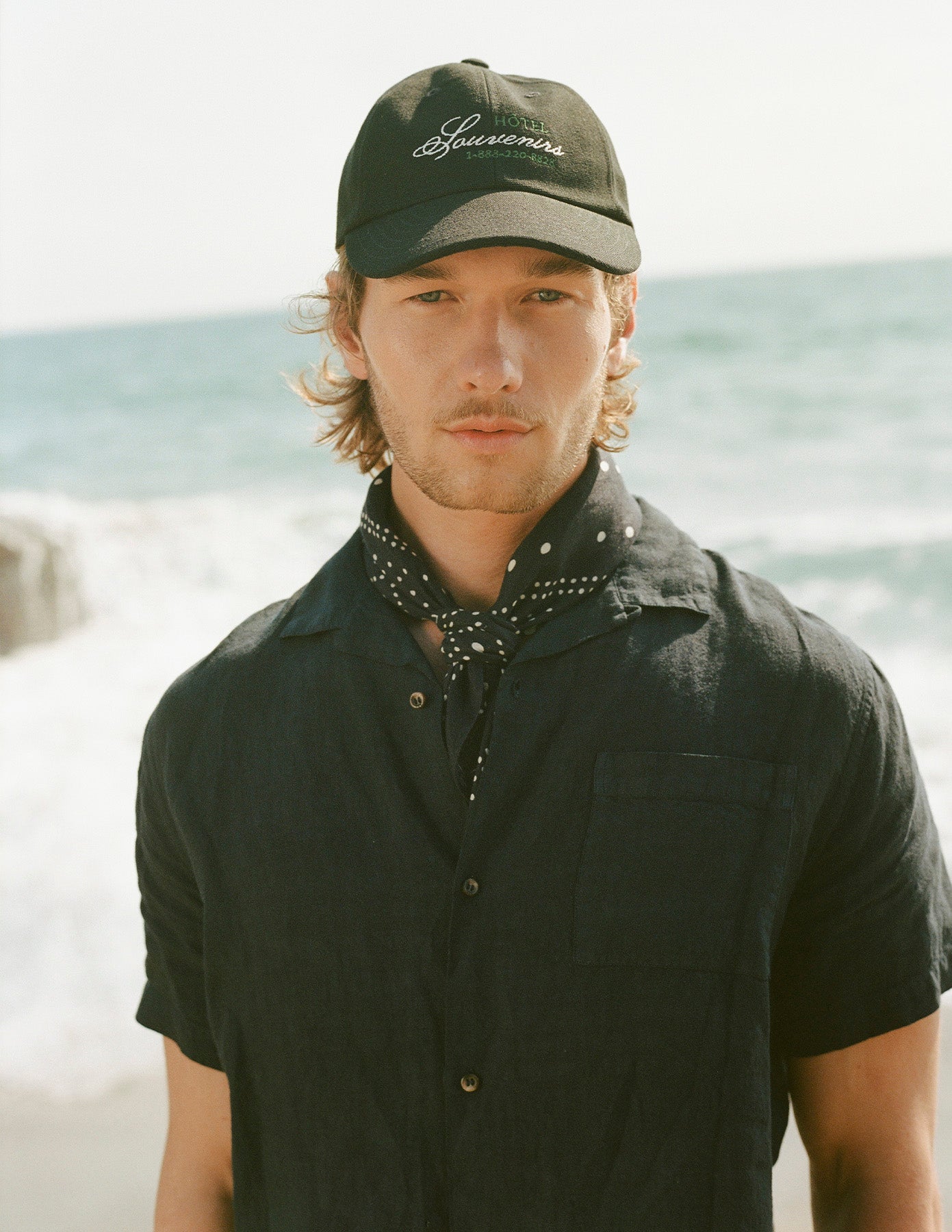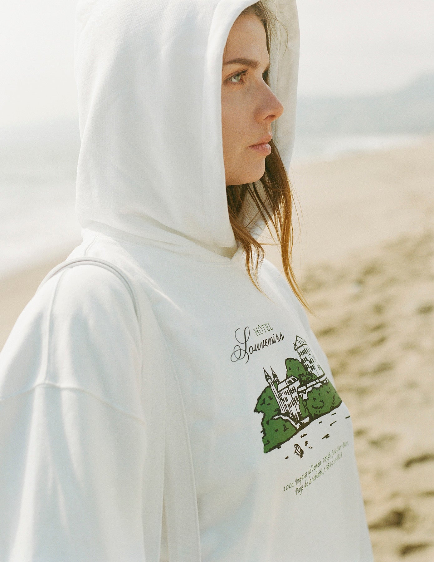 The interaction is made up of two themes — the first translates into a monochrome dark navy total look, whilst the second, radically different, features a series of sweatshirts, t-shirts, caps, and tote-bags bearing the branding of “Hôtel Souvenirs”.