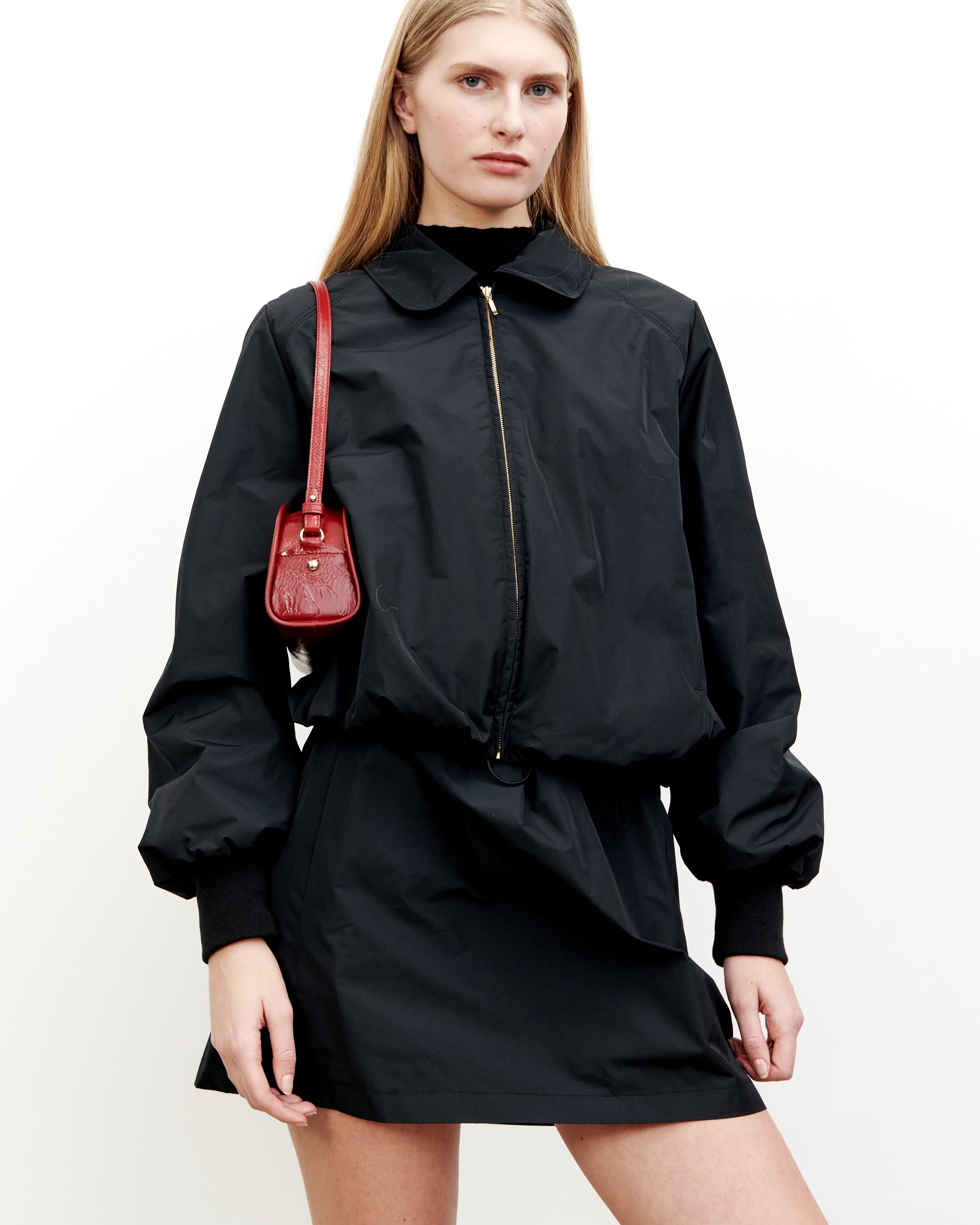 Black flowing long-sleeve polo shirt with silvertone buttons.