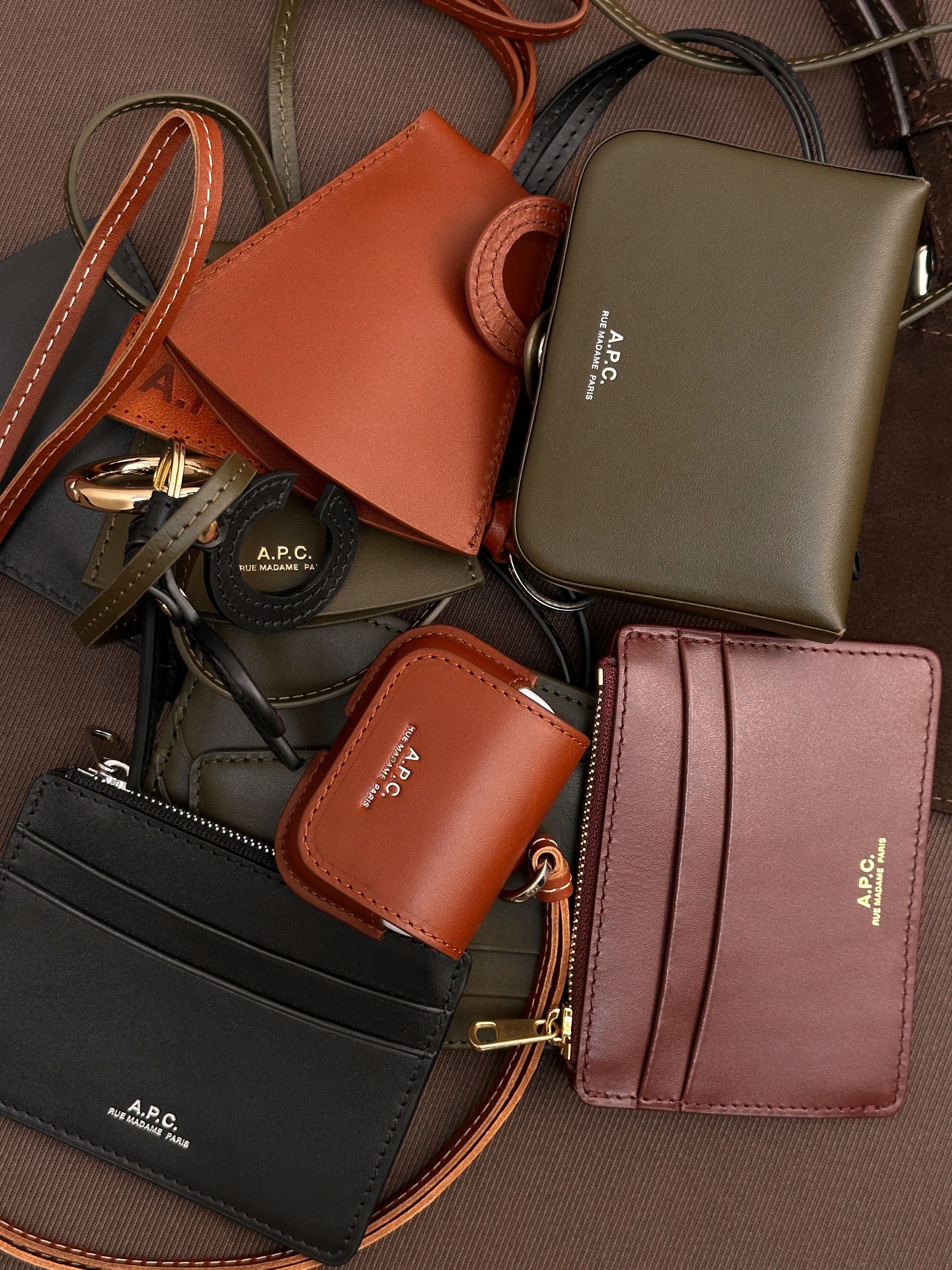 Key ring in smooth nut brown leather embossed with A.P.C.